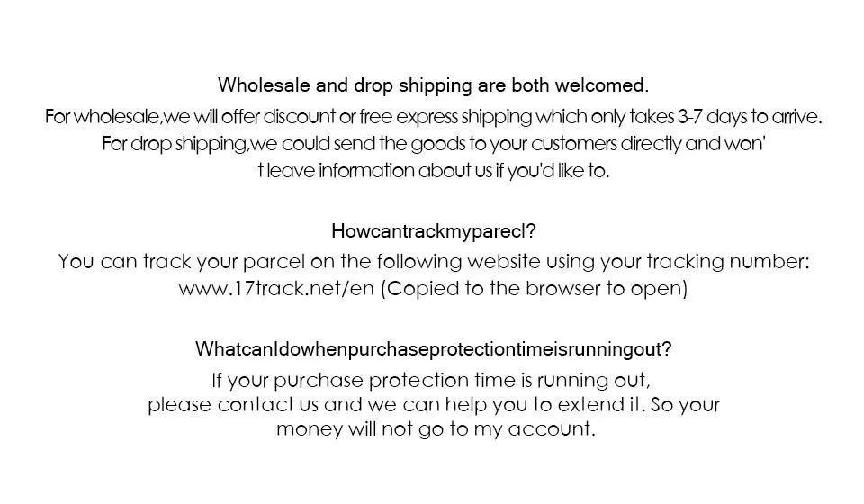 We support direct shipping.If you have many orders, we can order via Excel and pay via Paypal.<>I will not provide any information about the store in the product.<>You can leave a message and contact me via WeChat.
