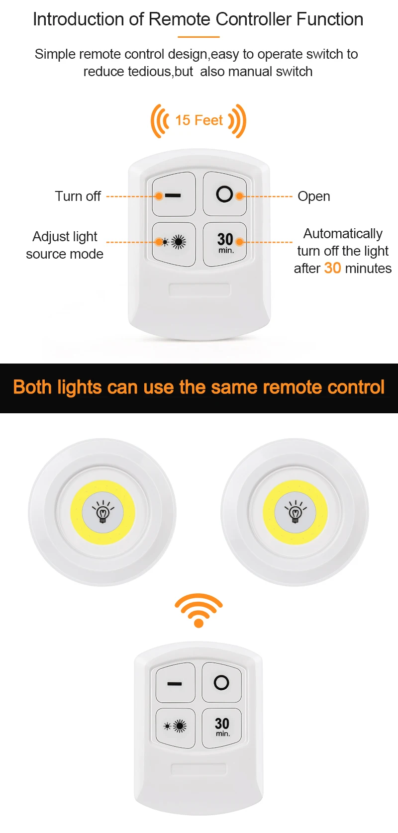 Turn the led puck light with the remote or press dome button manually. The best remote control far range about 15 feet. Easy to use and very convenient to control.