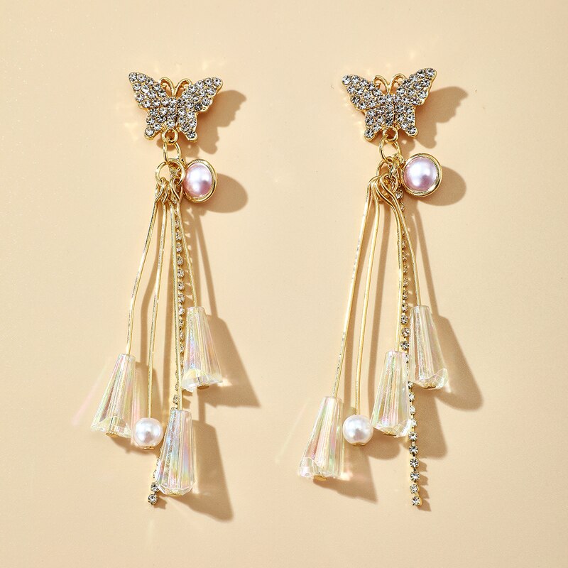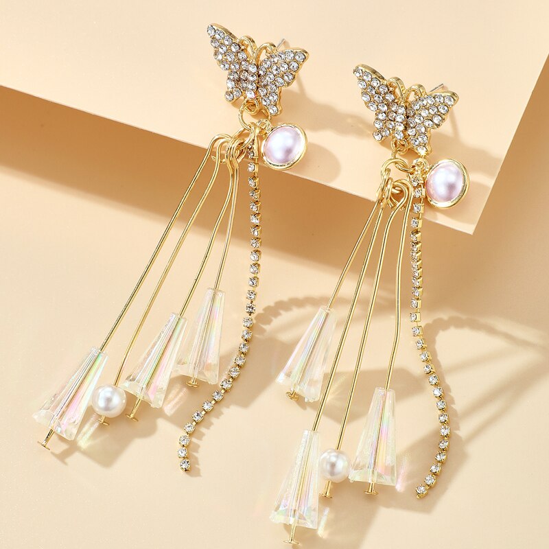 Luxury Crystal Butterfly Stud Earrings Dazzling Rhinestone Imitation Pearl Tassel Dangle Drop Earrings for Women Party Jewelry