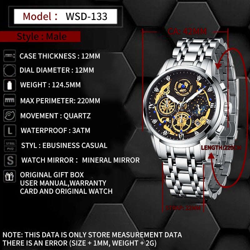 【Dial diameter: 42 mm】【Case thickness: 12 mm】【Watch length: 220 mm】【Bandwidth: 22 mm】【Table weight: 124.5 grams】