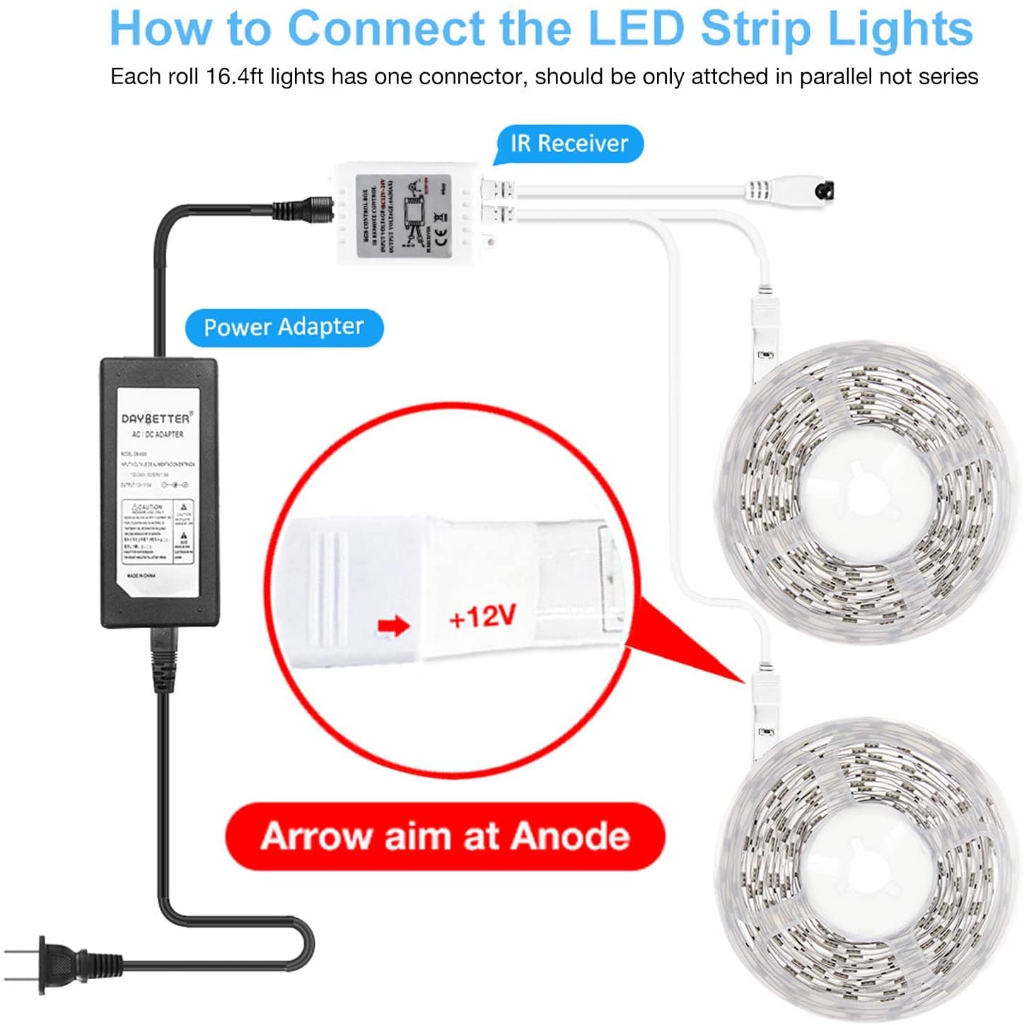 1. Please ensure the "→" arrow mark (on female connector) and " 12v" mark (on strip light) are on the SAME side. If not, it won't work. Please unplug, rotate and replug.